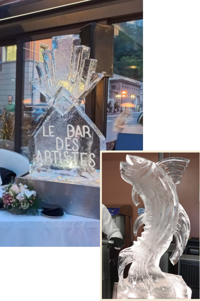 Les sculptures de glace peuvent être installées sur place, prêtes à être admirées par les invités dès leur arrivée, ou réalisées en direct lors de l’événement. La sculpture en live constitue une animation d’exception : le public assiste à la transformation progressive du bloc de glace brut en une œuvre finie, suscitant curiosité, échanges et fascination.