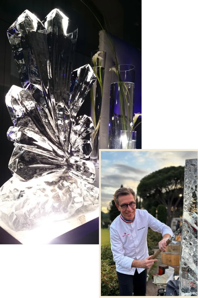 Parmi les multiples facettes du savoir-faire de Gérard Cabiron, la sculpture sur glace occupe une place à part. À la croisée de l’art, de la technique et de l’événementiel, cette discipline exigeante révèle pleinement sa créativité, sa maîtrise du geste et son goût pour les expériences visuelles à fort impact. Véritable signature lors des événements, la sculpture de glace crée un effet « waouh » immédiat, marquant durablement les esprits par son caractère éphémère et spectaculaire.